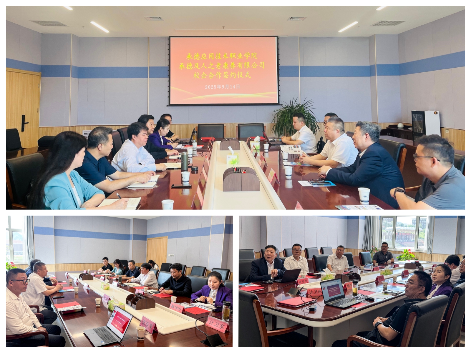 2025年9月14日,承德及人之老康养有限公司与承德应用技术职业学院企校战略合作签约仪式在承德应用职业技术学院隆重举行。刘连军董事长作为承德及人之老康养有限公司投资人、承德养老服务业协会名誉会长带领承德及人之老康养有限公司执行董事兼总经理张开、项目总监蔡友斌、技术经理陈军、行政经理张至昊赴该学院参观调研并参加了签约活动。